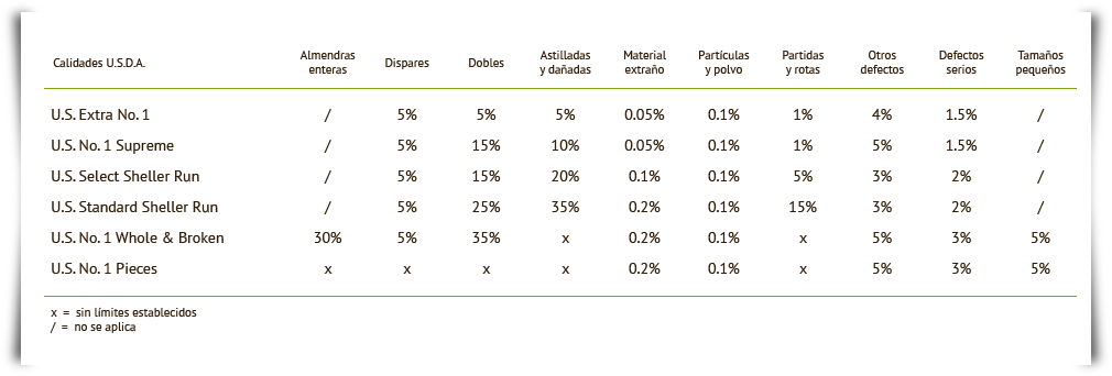 Los USDA Grades para Almendras al Natural son mínimos estándares voluntarios establecidos por la Industria. Grupo Importador Espanola (GIE) puede proveerle sus necesidades especiales de Almendra, en términos de Tamaños y Calidades y basado en las siguientes especificaciones.